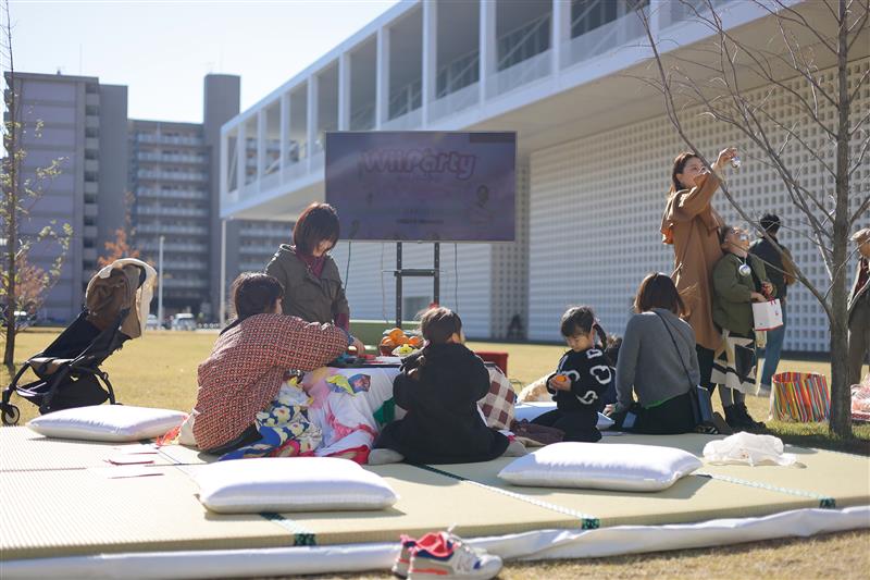 室内で行うことを外に持ち出す。芝生の上にリビングのような空間を作り、師走の日曜日の午後をまったりと過ごします。